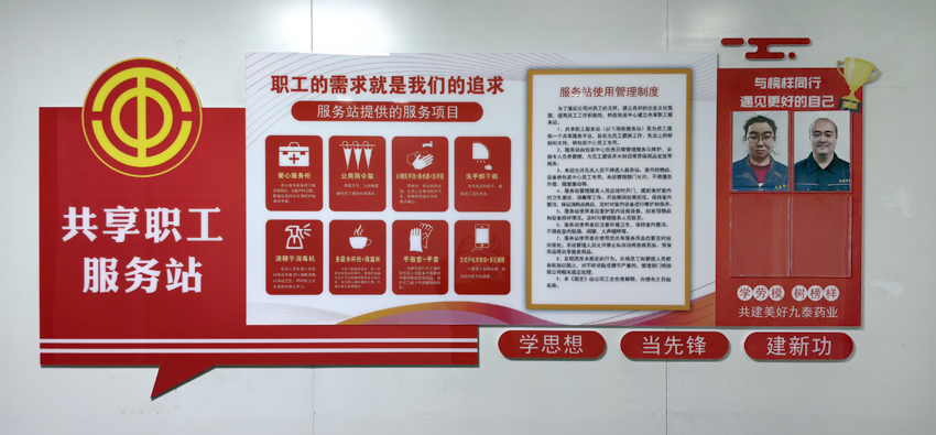 11月25日,公司第一個(gè)共享職工服務(wù)站在包裝中心成立并投入使用。共享職工服務(wù)站文化墻上醒目地提示著共享服務(wù)項(xiàng)目、使用管理辦法,為了豐富文化墻內(nèi)容,還增添了“與榜樣同行遇見更好的自己”優(yōu)秀員工光榮榜。共享職工服務(wù)站內(nèi)共享物品齊全,擺放整齊,共享設(shè)施設(shè)備即符合藥企規(guī)范,也充滿溫馨,充滿愛意。服務(wù)站提供的服務(wù)項(xiàng)目包括:1、愛心服務(wù)柜。愛心服務(wù)柜備用日常應(yīng)急藥品,以備不時(shí)之需;包裝中心員工每天高效、重復(fù)的包裝動(dòng)作很容易被包材劃傷手部,愛心服務(wù)柜為包裝崗位員工配備了處理傷口的藥品和防護(hù)用品。2、公用雨傘。雨雪天氣,為特殊需要的員工提供共享雨傘。3、白鋼洗手池+熱水器+洗手液。洗手池帶有冷、熱水調(diào)節(jié)開關(guān),讓員工在寒冷的天氣里,能夠使用溫水洗手,暖手暖心。4、洗手烘干機(jī)。員工進(jìn)入操作間洗手后及時(shí)烘干,確保員工衛(wèi)生安全。5、酒精手消毒機(jī)。包裝人員在進(jìn)入包裝間前雙手要進(jìn)行酒精消毒,以保證衛(wèi)生,同時(shí)防止交叉感染和病從手入。6、多層水杯柜+保溫杯。為每一名員工配備了大容量保溫杯,統(tǒng)一存放在多層水杯柜中,根據(jù)姓名、編號(hào),員工可以快捷地找到自己的水杯,為員工喝熱水提供方便,環(huán)境也更加美觀整潔。7、手指套+手套。服務(wù)站為常年進(jìn)行手工操作的包裝人員配備了手指套和手套特殊的勞保用品,保護(hù)員工減少手部磨損和受傷。8、立式手機(jī)充電站+多孔插排。方便員工各種品牌、型號(hào)的手機(jī)充電需要。